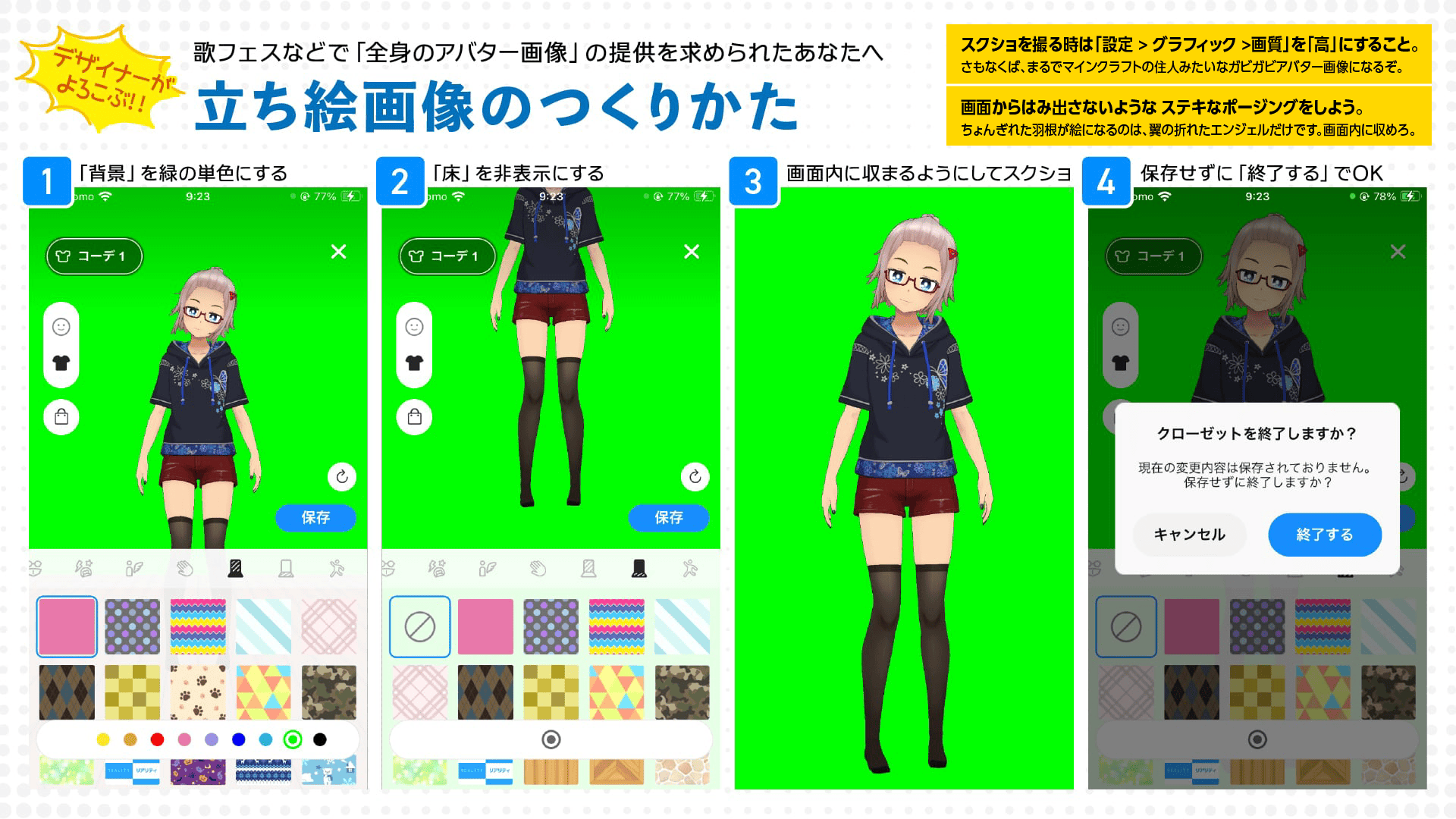 本企画では、開催告知や企画本編で使用するための「アバター画像」を、参加申し込み時点で提出していただきます。あらかじめ以下の図説に従って出演者様の立ち絵画像をご用意ください。
